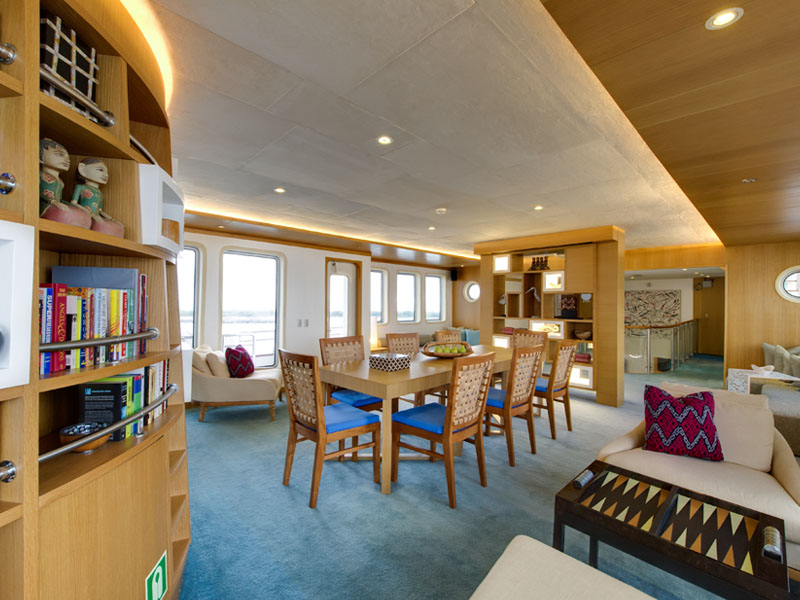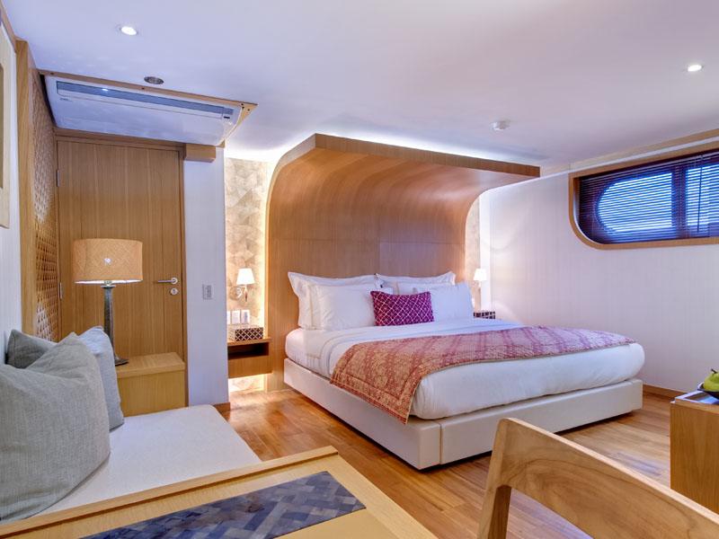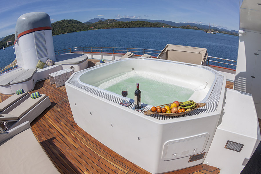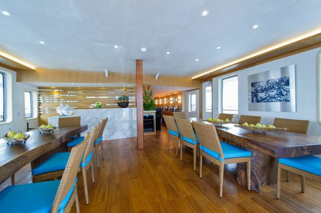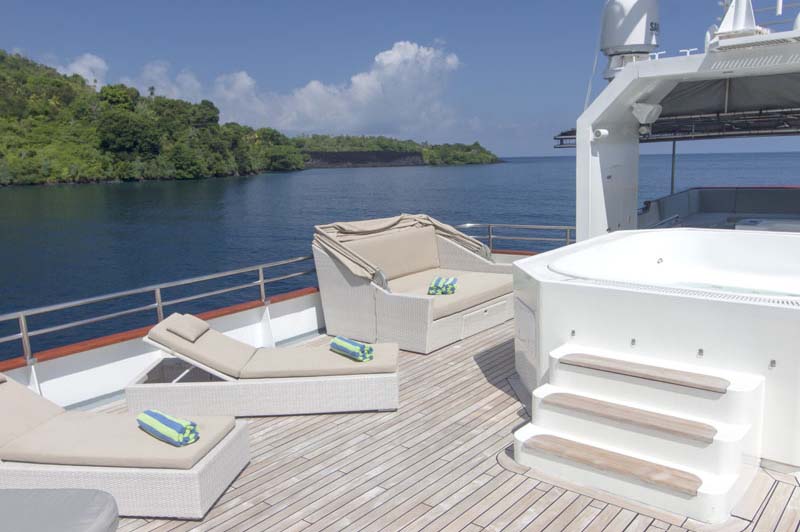 It comes fully equipped with everything needed for a fun filled adventure. There are 6 kayaks, stand up paddle board and wake board, fishing equipment, diving equipment, a trampoline and inflatable and towable toys for fun of all ages. There is also a Jacuzzi and ample sunbeds for all guests. A library, a bar and very large dining area makes this boat feel like a luxury house on water.